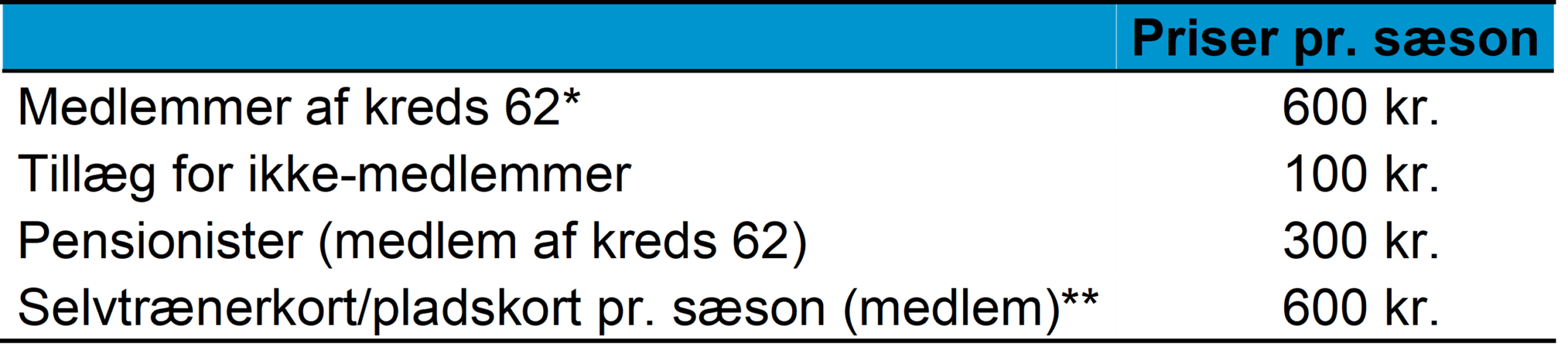 (kredsmedlem: 600 kr. per sæson, ej medlem: 700 kr. per sæson)